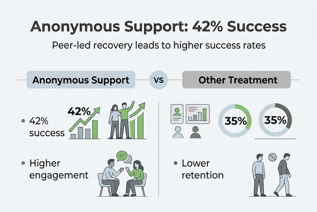 | Data-backed recovery gains | Anonymous peer support leads to higher engagement and better abstinence rates than many traditional methods. |